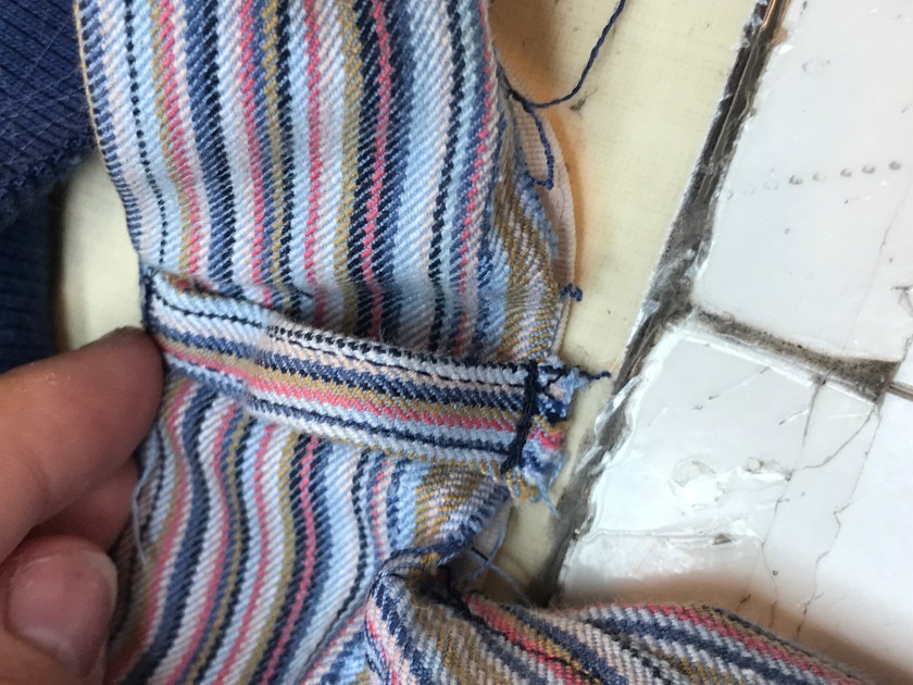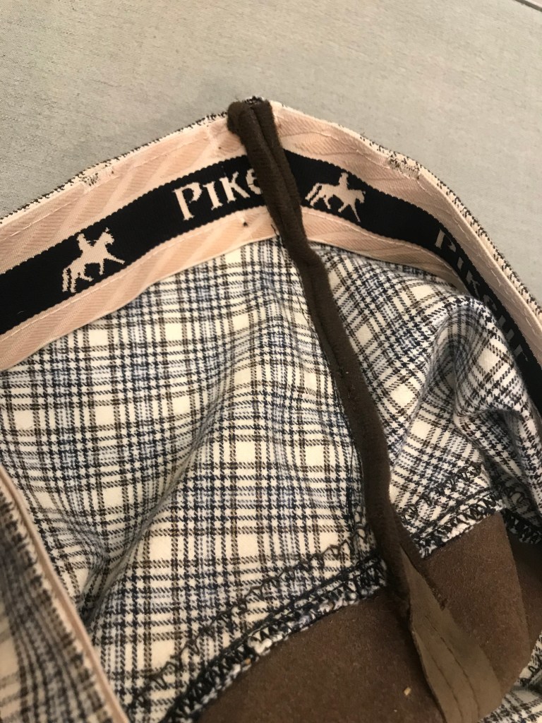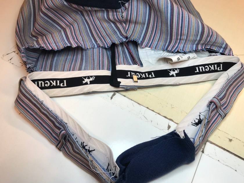 Ratsastushousujen takaosaa piti suurentaa, sekä vyötärö piti ommella uudestaan, sillä siihen lisättiin kuminauha kankaanpalan kera.Housut näyttivät tältä ennen vyötärön ompelua housuihin, ompelin vyönsoljet kiinni ensin aputikkauksella kiinni vyötäröön ja sen jälkeen housuihin vyötärön osan.Ompelin siis vyönsoljen aputikkauksella kiinni vyötäröön.