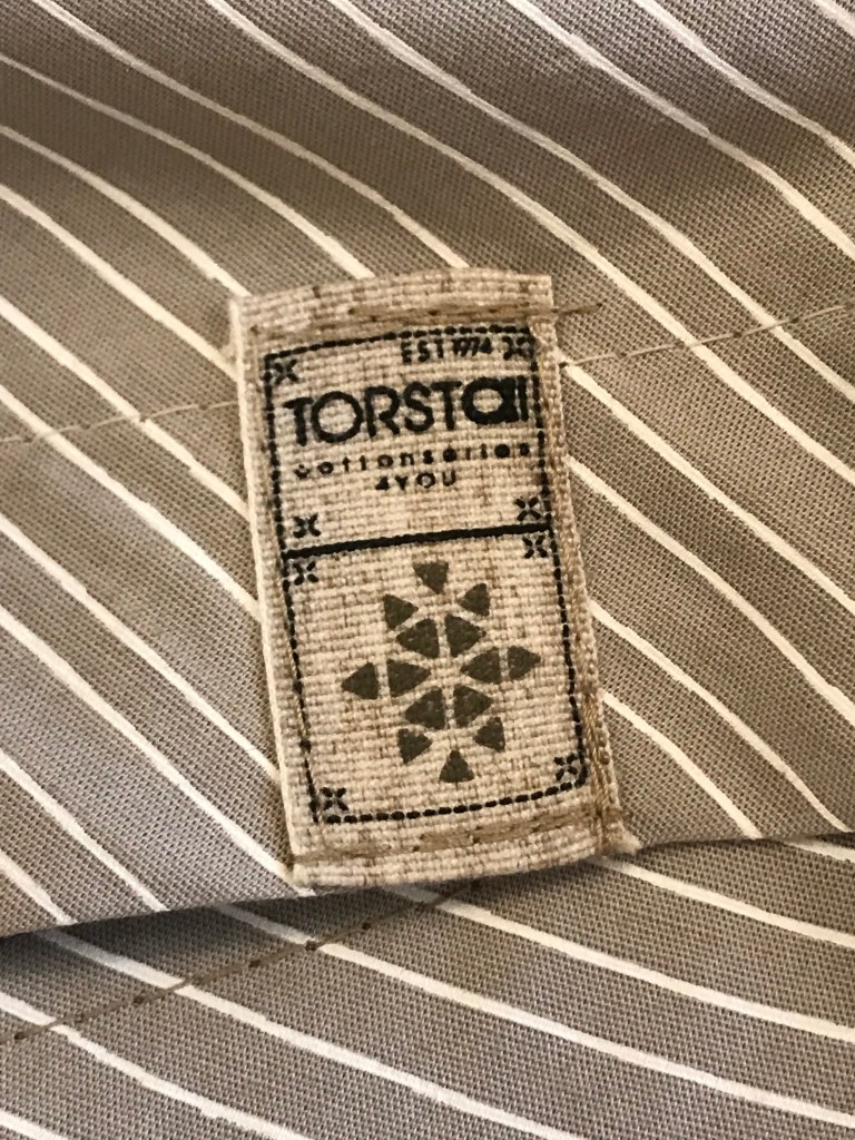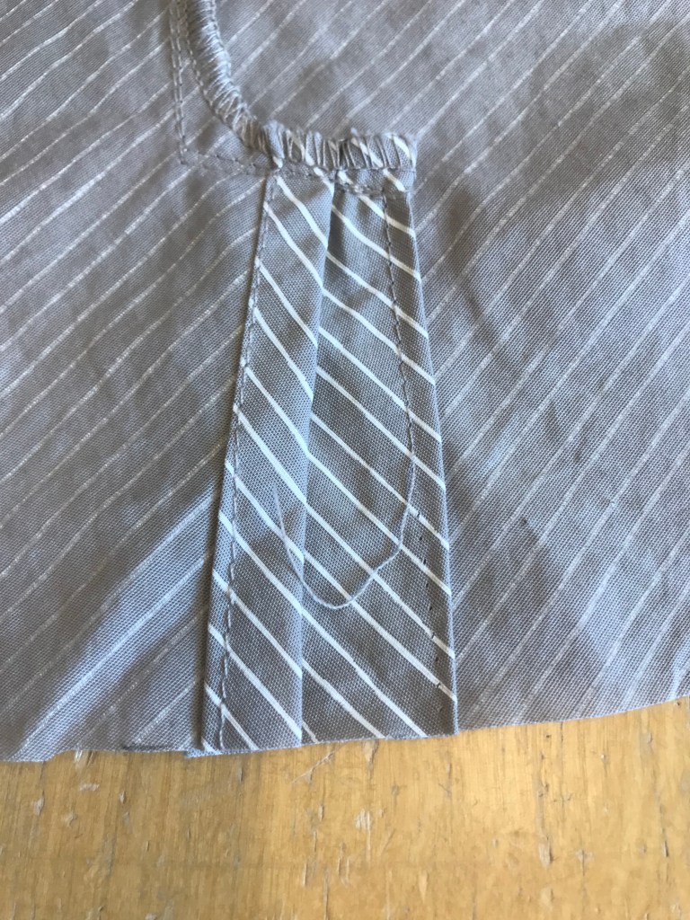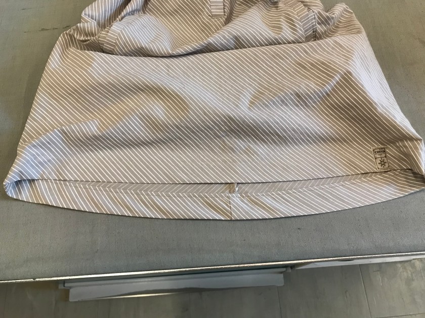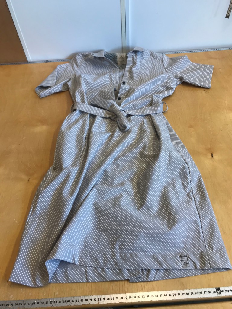 Helmasta piti ensin lyhentää 4cm, sen jälkeen se leikattiin. Sitten piti ommella ”halkeama” kiinni ja huolitella se siistiksi.Tästä halkeamasta ratkottiin siis oikeanpuolimmainen ommel jatkaen sitä vasempaan ylänurkkaan. Sitten leikattiin ylimääräinen pala pois ja huoliteltiin jatkaen vanhan huolittelun ommelta.Irroitin myös tämän merkin ja siirsin sen paikan suurinpiirtein samalle kohdalle missä se aiemmin oli.Uusi lyhennetty mekko näytti sen jälkeen tältä. Alavaran mitta oli kokonaisuudessaan 7cm, mutta taitettuna sisäänpäin mitta oli 3,5cm.
