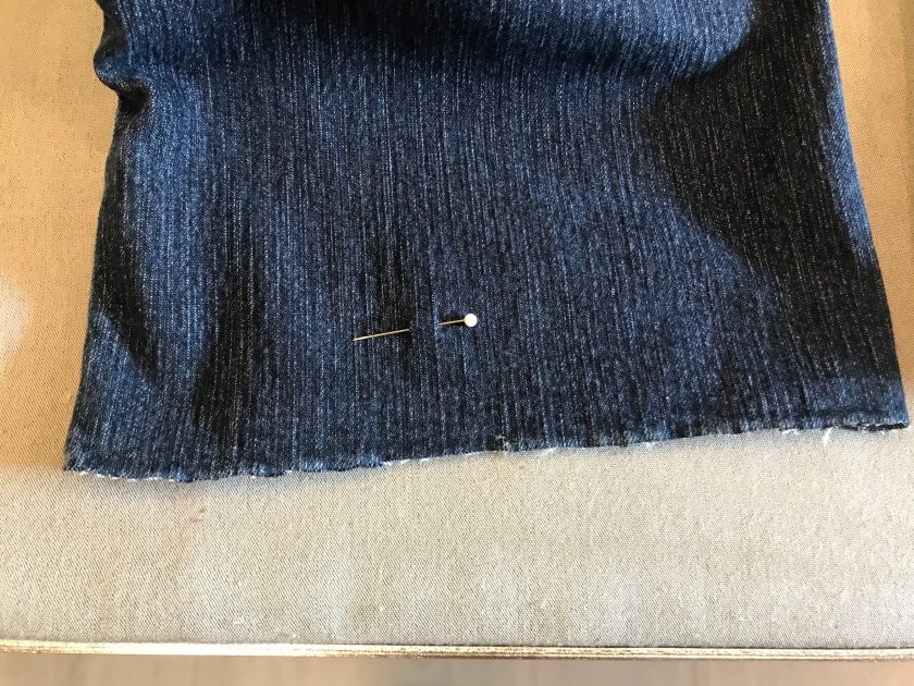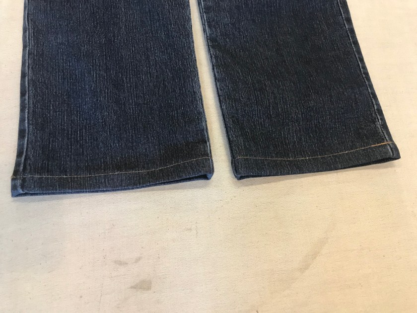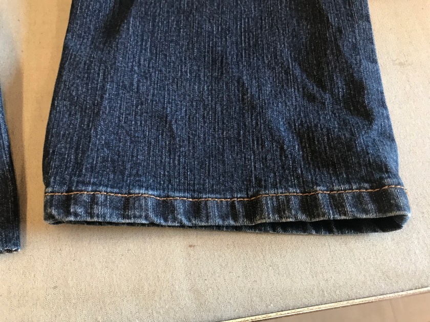 Ensin piti leikata ompeleen yläpuolelta ja sen jälkeen piti silittää. Sitten mittasin 3cm, sillä päärmeen mitta piti olla 1,5cm, joka taitettiin sisäpuolelle.Leikattuna, sekä silitettynä lahje näytti tältä. Tämän jälkeen lahje oli tarkoitus silittää niin, että lahje on taitettuna 3cm sisäpuolelle.Valmiit lahkeet näyttivät tältä. Lahkeet silitettiin vielä kunnolla. Lahkeet ommeltiin samalla värillä, millä ne oli aikaisemmin ommeltu.