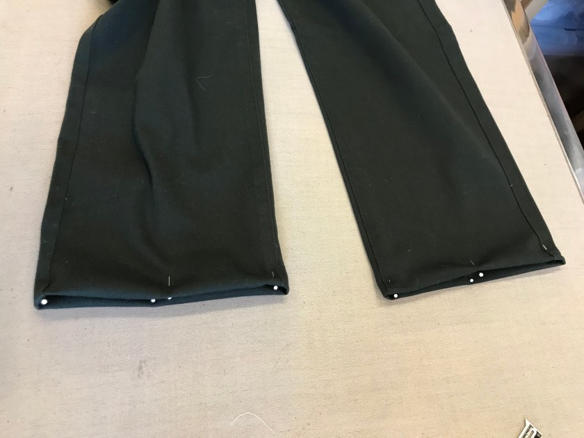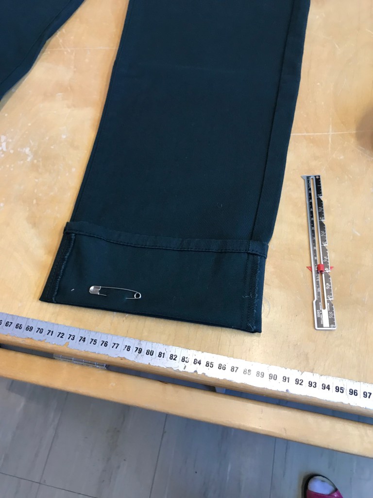 Housuista piti lyhentää 4cm ja tehdä 3,5 cm käänne. Housut lyheni 7,5cm. Päärmevaraa jäi 1,5cm. Housut ommeltiin saman värisellä, millä aiemminkin.Housuihin oli tässä kohdassa merkattu ommeltavat kohdat. En valitettavasti ottanut valmiista housuista kuvidts, tai sitten otin, mutta ne eivät ilmeisesti tallentuneet.