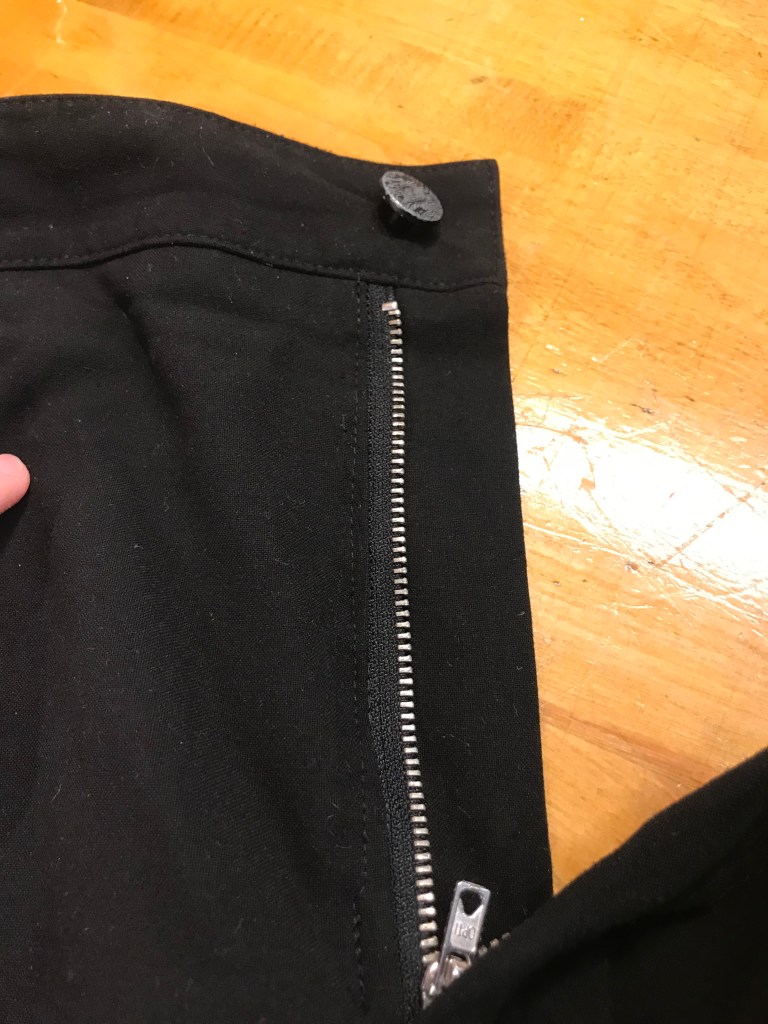 Farkuista piti vahvistaa eli ommella uudestaan vetoketju kiinni farkkuihin, sillä se oli lähtenyt irti ja asiakas oli itse käsiompeleella yrittänyt ommella sitä kiinni.