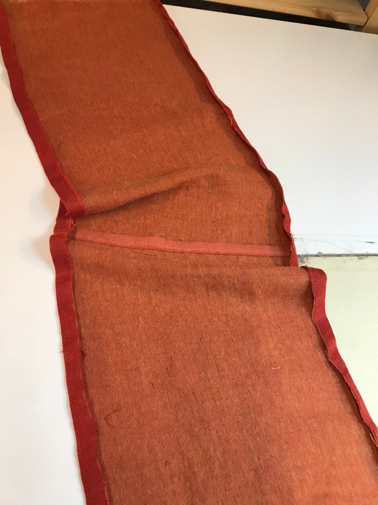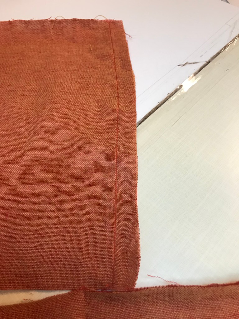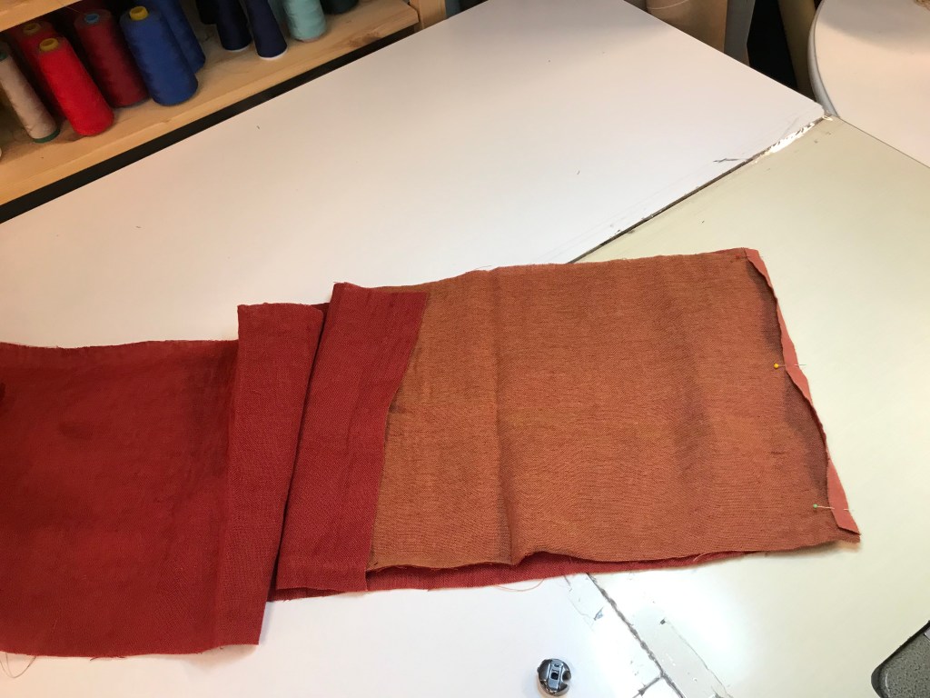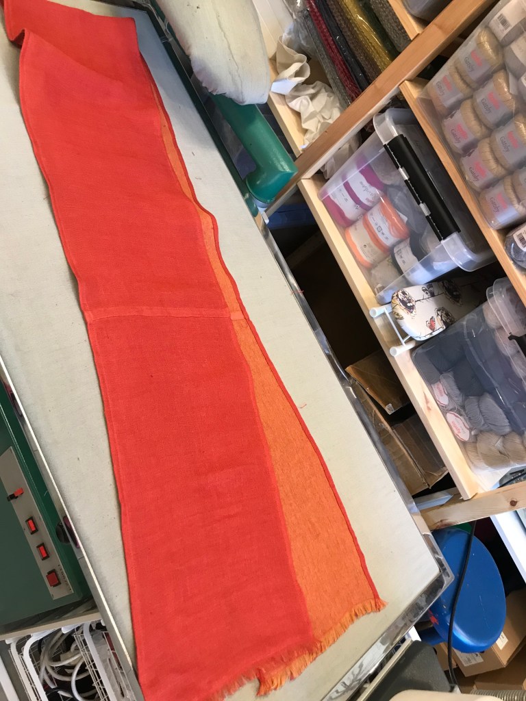Tästä kaulahuivista piti siis ommella nuo nuppineuloilla merkityt kohdat. Eli sivusauma piti ommella.Reunat piti ommella 2,5-3 tikillä kahdesti, sillä päätyihin tehtiin hapsut ja se ei saanut missään tapauksessa purkautua.Hapsut näyttivät valmiina tältä ja ensikertalaiseksi meni todella hyvin. käytännssä siis lankoja piti vain vetää pois, että siihen tulisi tuuheat hapsut, mutta varovasti.Sivusaumoihin tehtiin tuollaiset käänteet. 1,5cm mittaiset käänteet ja 0,5cm päärme.Tässä viimeinen kuva kaulahuvista, valotuksen takia huivi näyttää todella kirkkaalta, mutta huivi ei tosiasiassa ollut noin kirkkaan värinen. Huivi on silitetty ja ommeltu sivuilta.