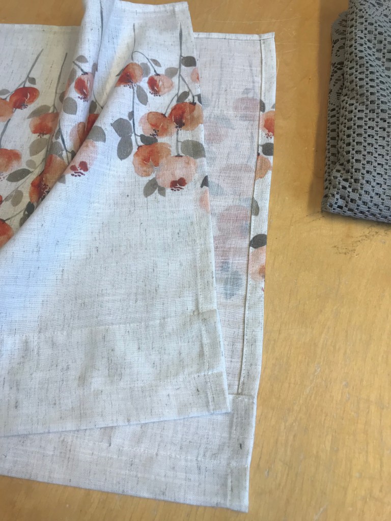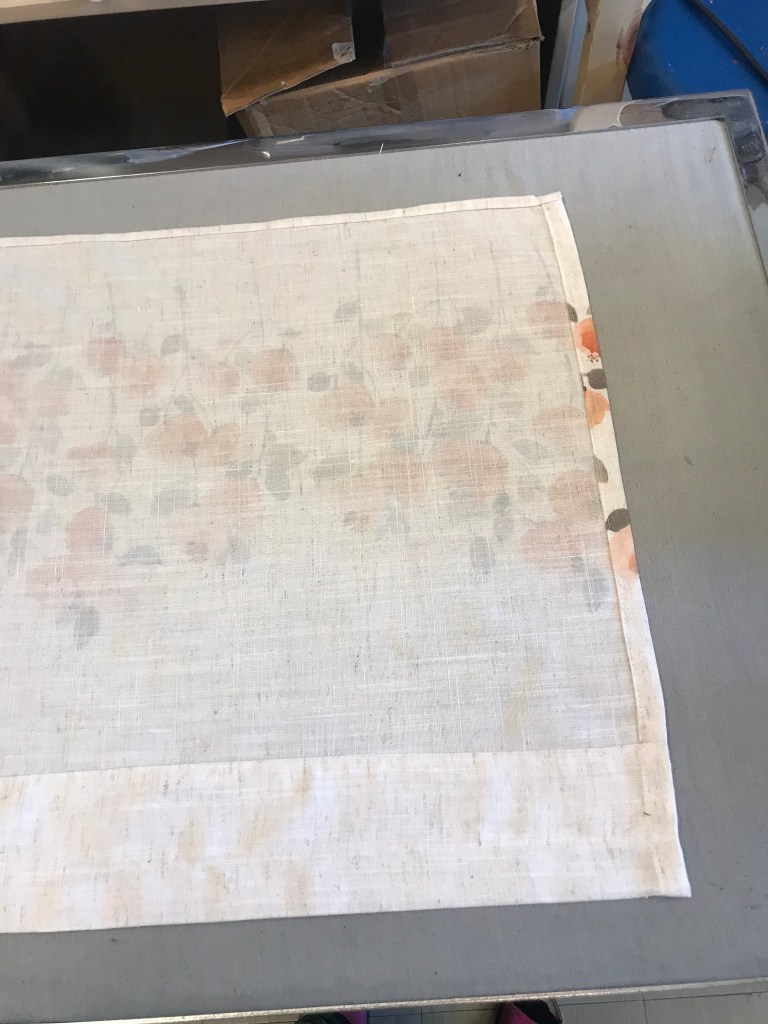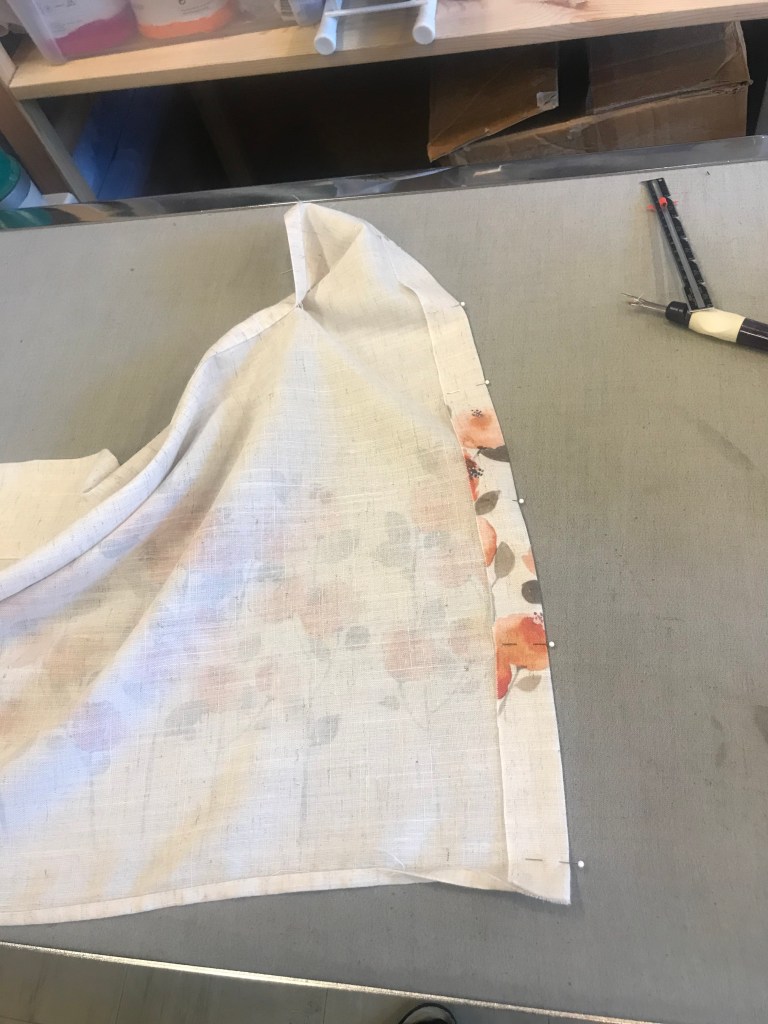 Tässä kuvassa olen merkinnyt ommeltavat kohdat nuppineuloilla. Sen jälkeen sivusaumat piti ommella takaisin niin, miten ne olivat ennen purkamista.Kyseisestä kankaasta piti ommella 1,5cm päärme ja ommella sivut takaisin niin, miten ne olivat.Tässä on lopputulos koko verhokankaasta silitettynä ja viimeisteltynä.
