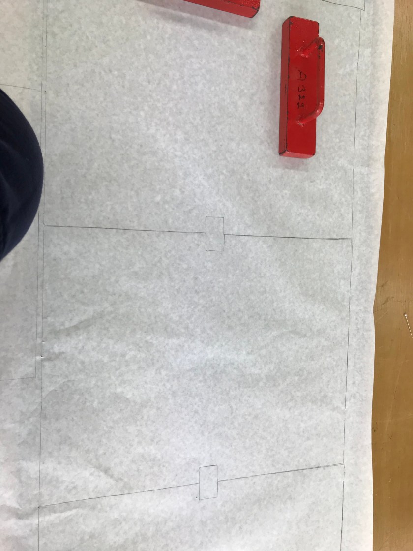 Paperiin on piirretty kassin kaavan muoto juuri ennen kankaaseen asettelemista. Painot asetettiin siksi, ettei paperi liiku, kun kaavojen muotoa piirretään paperille. Paperissa on kolme kassin muotoa ja kuusi kahvan muotoa. Kuva on vähän huonosti, sillä sen piti olla vaakatasossa, mutten saanut sitä tuon paremmin.